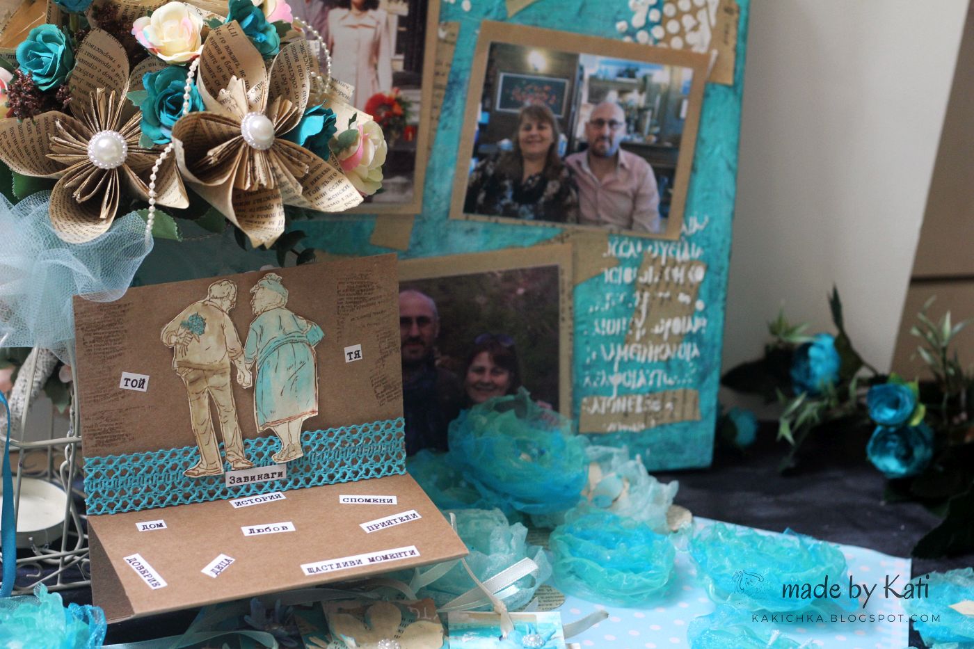 Междувремено във Варна и Плевен се раждат други вълшебства - кутия за подаръци, албум, 200 метра сърца, малки и големи хартиени цветя. А при мен всичко е хартия, дантели и тюркоаз. На финала решавам, че ще правя платно със снимки преди и след... защото споменах ли, че булката и младоженецът са женени? И то от 20 години. Просто толкова много се обичат, че искат повторно да го изкрещят на света.